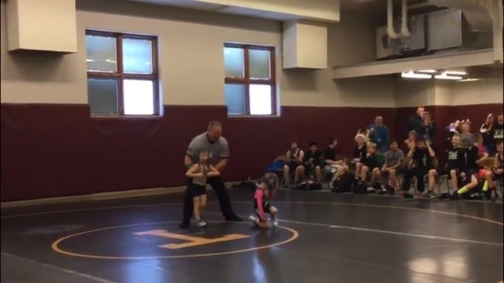 Kleine held redt zijn zusje tijdens een worstelwedstrijd