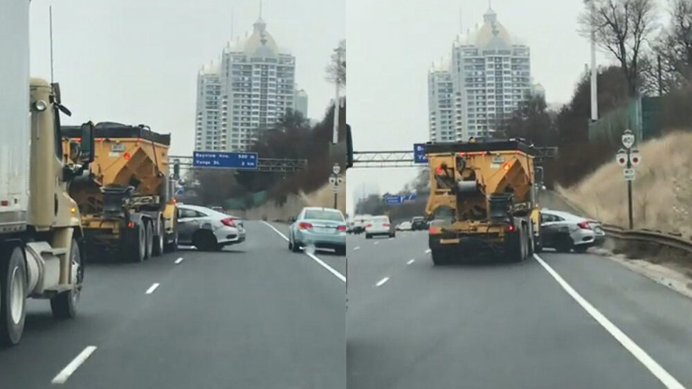 Barmhartige vrachtwagenchauffeur schuift auto netjes naar de vluchtstrook