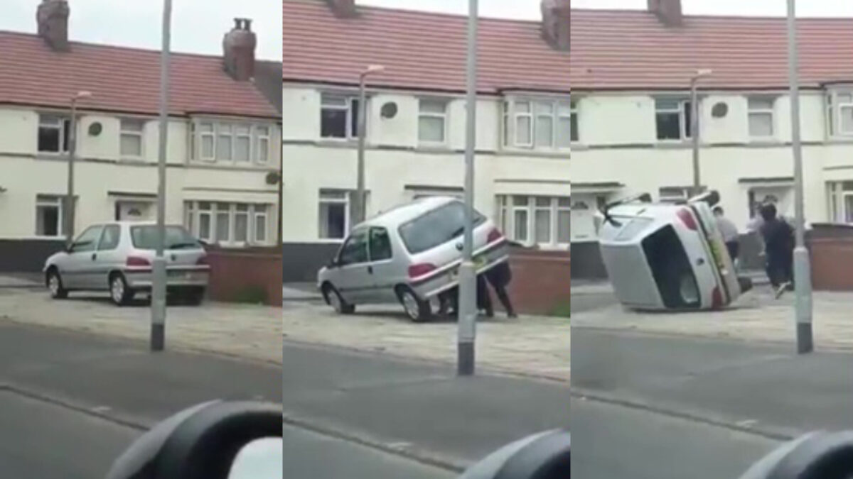 Britse eikeltjes flippen een willekeurige auto op z'n kantje
