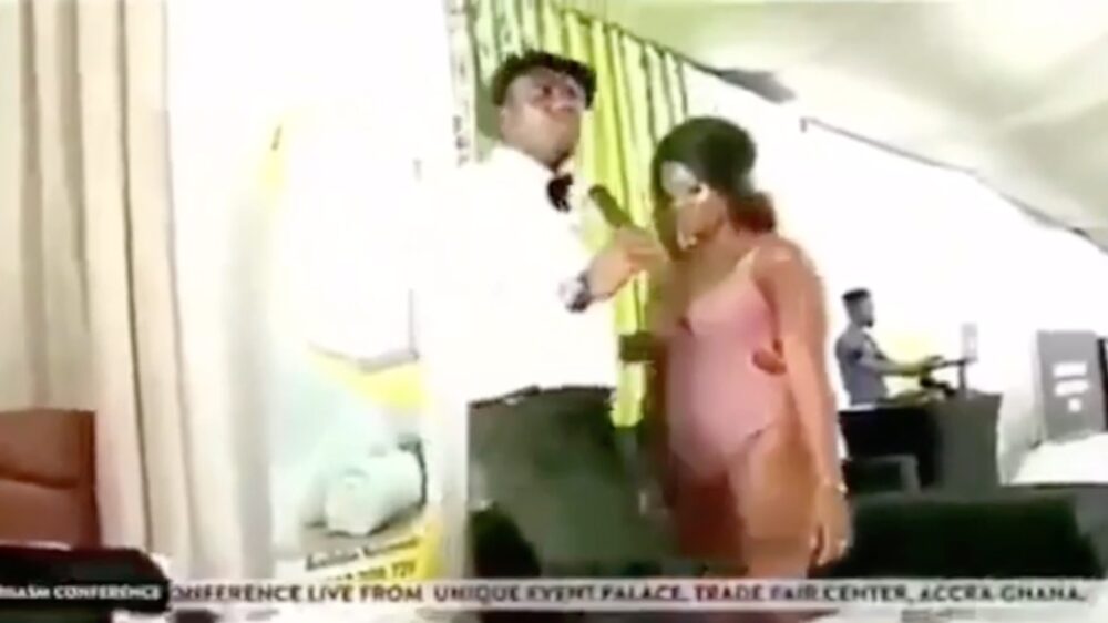 Om zijn aanhangers alles goed te laten begrijpen heeft hij voor een gelovige in uitdagende kledij gezorgd. Praise the lord!
