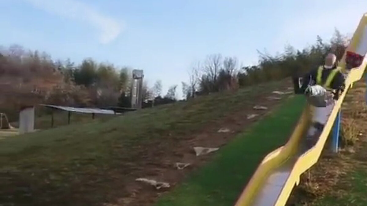 Na dit rondje glijbaan was het gedaan met zijn staartbotje Fails