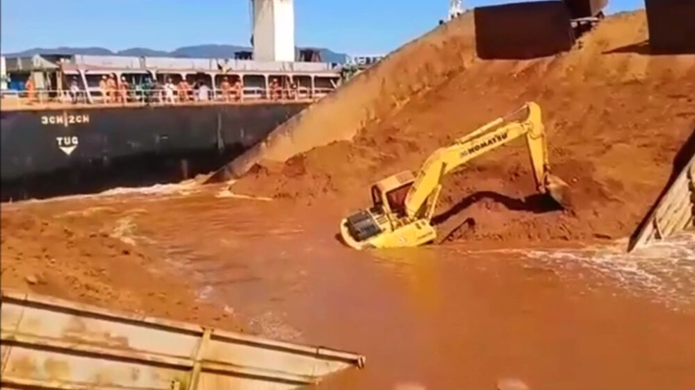 Baggerschip met kranen erop vouwt dubbel en zinkt naar de bodem