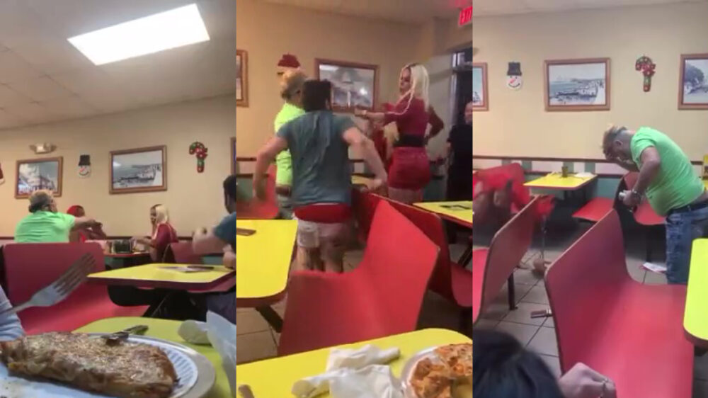 Naar verluidt komwn deze beelden uit een pizzeria in Hialeah. een stad vlakbij Miami. Deze transgender-dames werden lastiggevallen door een andere bezoeker, en lieten dat niet over hun kant gaan. We gokken dat het slachtoffer zijn lesje heeft geleerd.