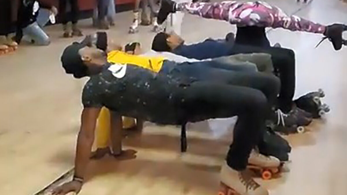 Rolschaatser springt over groepje heen maar komt nét iets te kort
