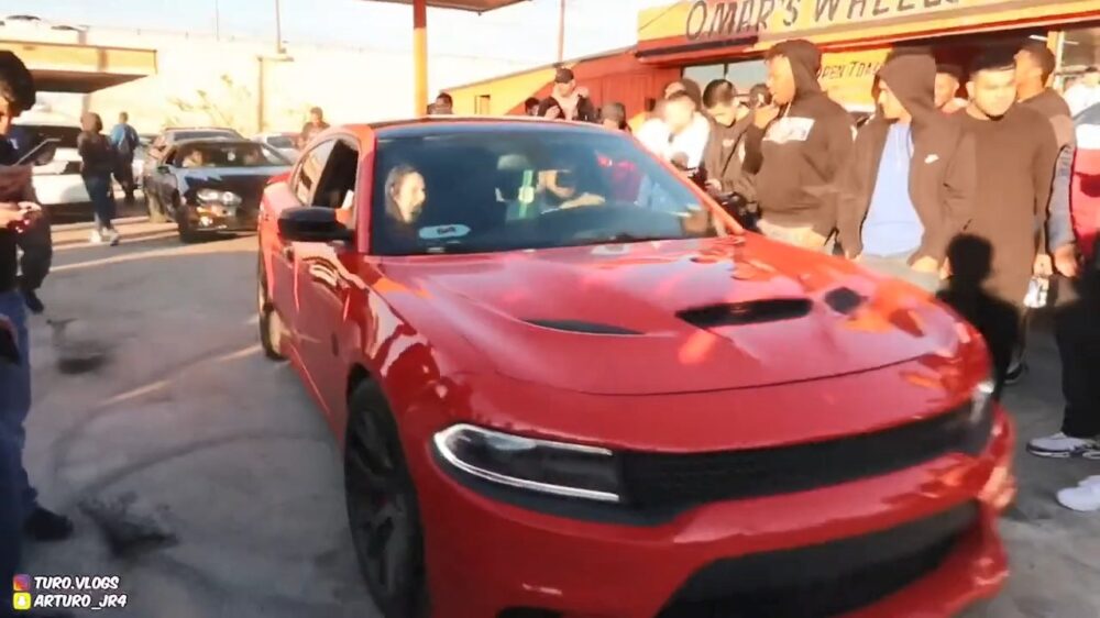 Dodge Hellcat drift het publiek in en bezorgt toeschouwer een ritje ziekenhuis