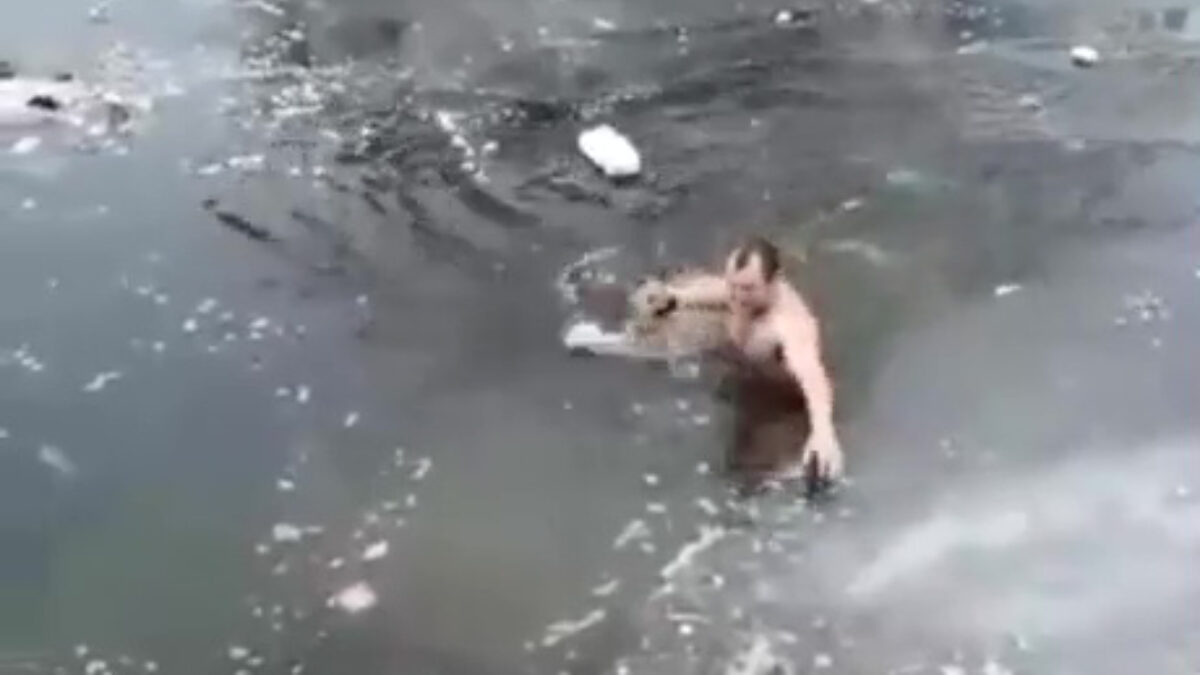 Het Russische gezinnetje dat aan de kant stond zag ineens hun jonge hond in het ijskoude water liggen, maar gelukkig was er een ongelooflijke eindbaas die niet nadacht en zo het water instapte om het beestje te redden. Niet elke held draagt een cape.