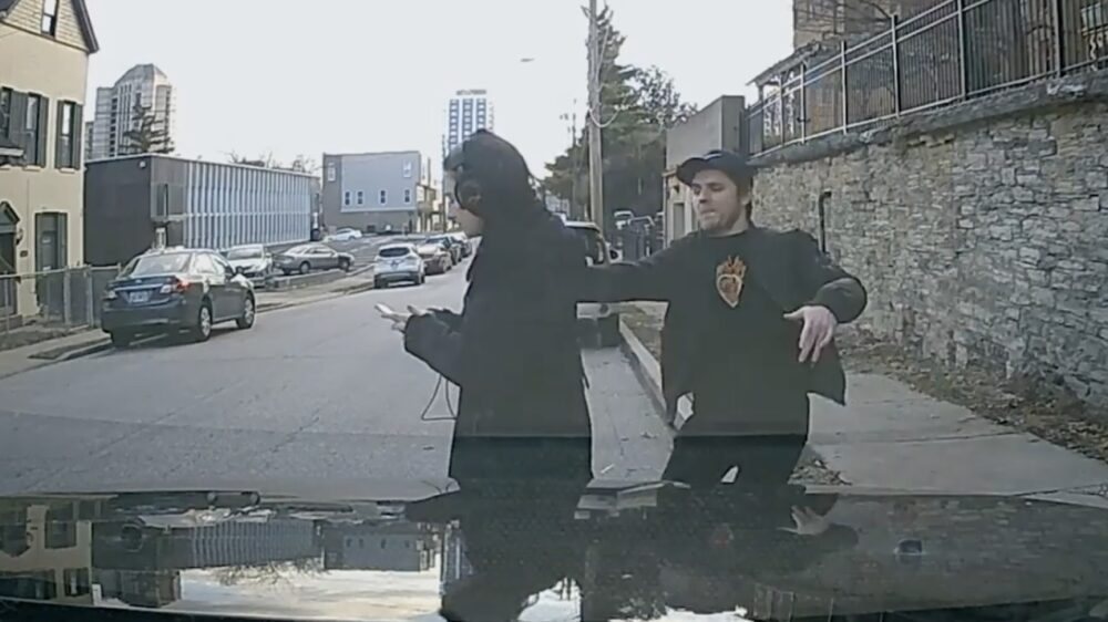 Appende Truus met koptelefoon wordt nét niet ondersteboven gereden dankzij oplettende eindbaas