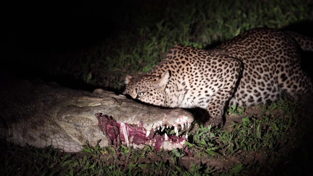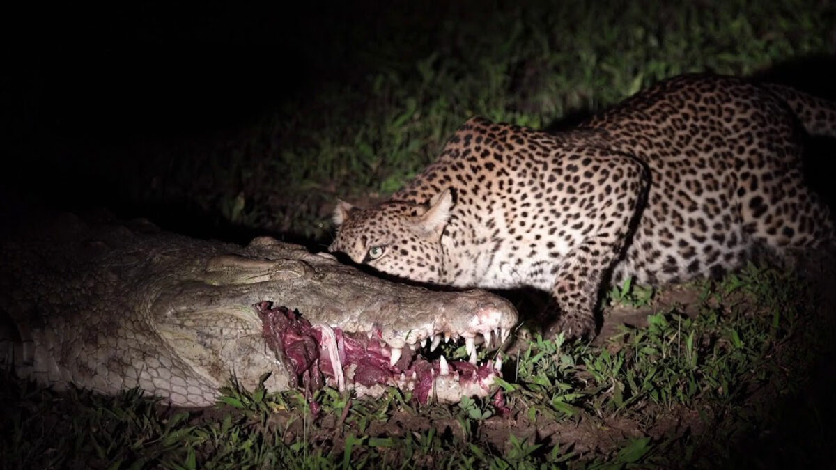 Deze badass luipaard weet wat hij wil en aarzelt geen seconde om brutaal een mals biefstukje uit de bek van een slaperige krokodil te jatten.