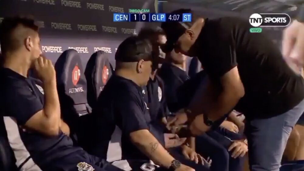 Rara, wat krijgt Maradona hier toegeschoven tijdens een live voetbalwedstrijd?