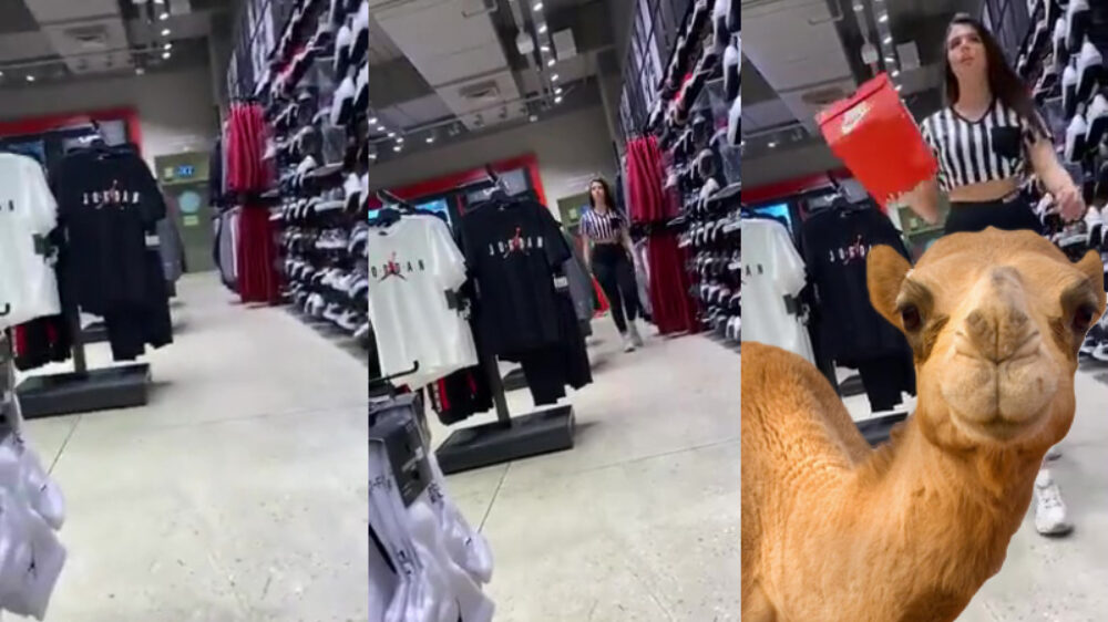 Zo'n dagje winkelen is voor veel mannen niet direct een ideaal uitje, en daarom probeert deze knakker er het beste van te maken door een filmpje te schieten met daarin een nogal extreme close-up van de verkoopster. Kan er iemand liplezen?