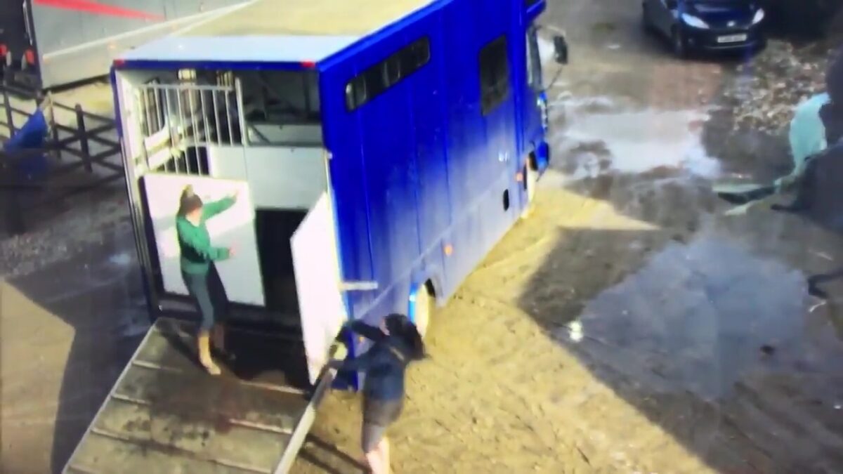 Paardenmeisje krijgt trailerdeur vol in d'r bakkes