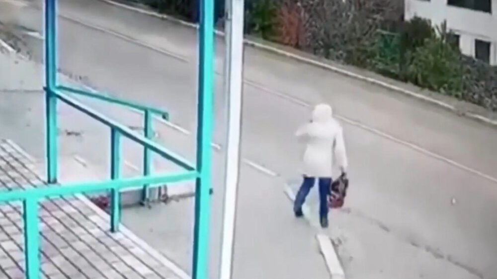 Close call deluxe: vrouw struikelt en belandt bijna met d'r hoofd onder een bus