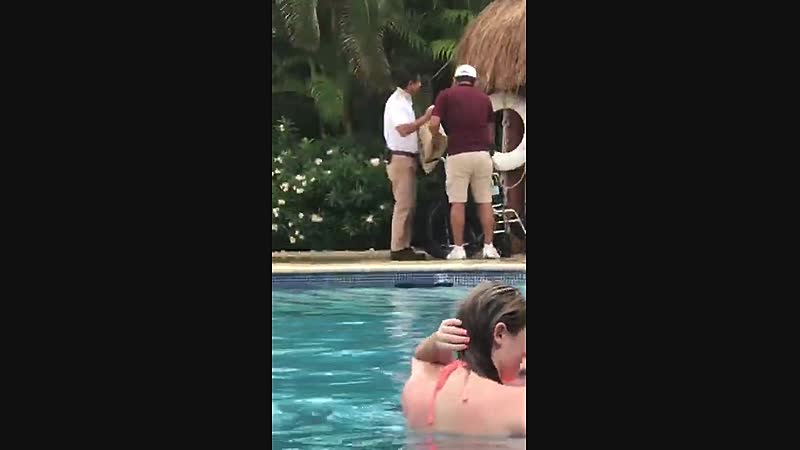 Stelletje zit kacheltjelam aan het zwembad op een resort in Mexico