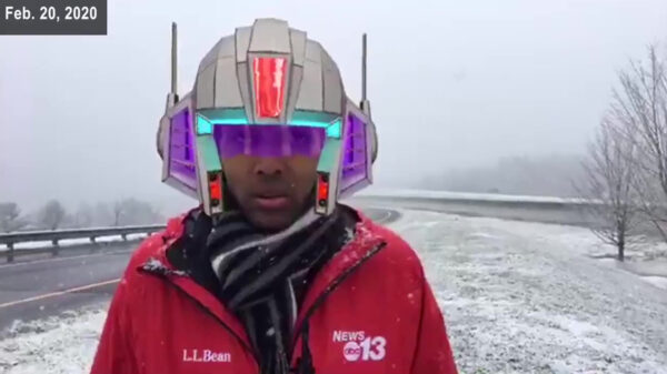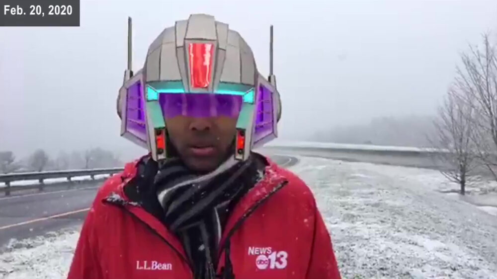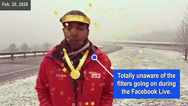 Justin Hinton van televisiezender WLOS ging live op Facebook om verslag uit te brengen van heftige sneeuwval. Allemaal leuk en aardig, maar de filmer was blijkbaar niet zo handig met telefoons en knalde zo het mystery-filter aan. Daar gaat je geloofwaardigheid.