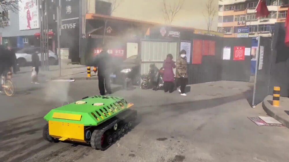 In China worden mini-tanks ingezet om complete wijken te desinfecteren