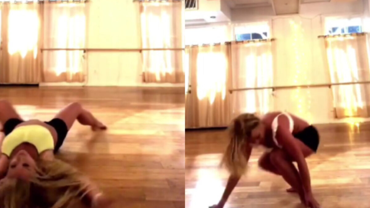 Britney Spears leeft nog steeds, en voor haar optredens moet natuurlijk geoefend worden. Ging niet helemaal lekker, want de duidelijk hoorbare krak voorspelt een lekker gipspootje... Auw.