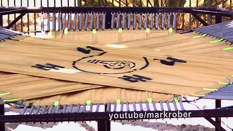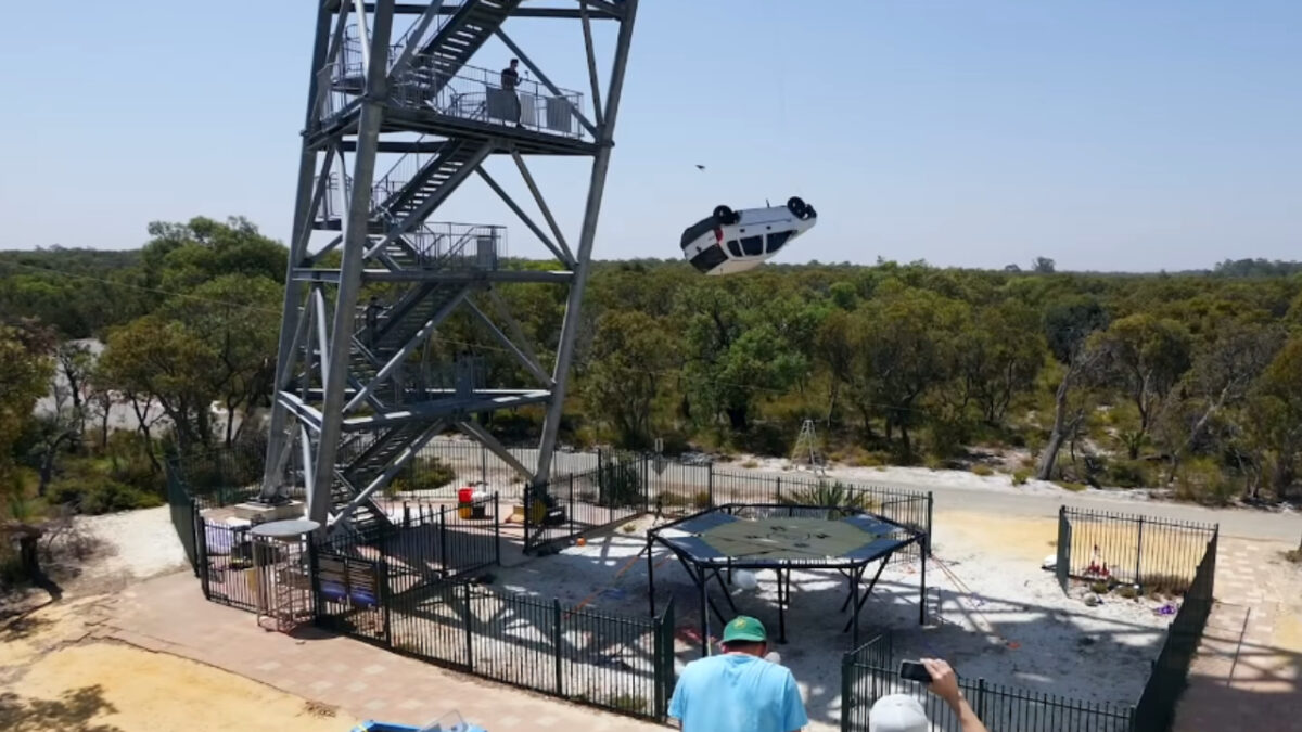 Doe eens gek, pleur eens een auto vanaf 44 meter hoogte op een trampoline