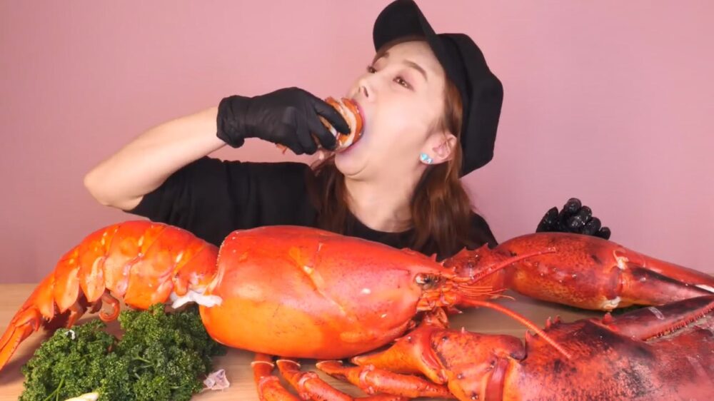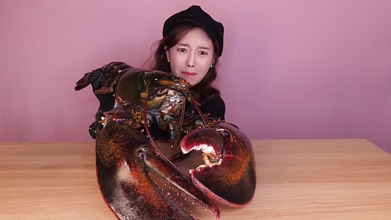Een tijdje terug zagen we hoe onze Zuid-Koreaanse keukenprinses aan de slag ging met een gigantisch glibberige octopus. Vandaag pakt ze nog iets groter uit en werkt ze een kreeft naar binnen waarvan alleen al z'n klauw groter is dan haar gezicht.