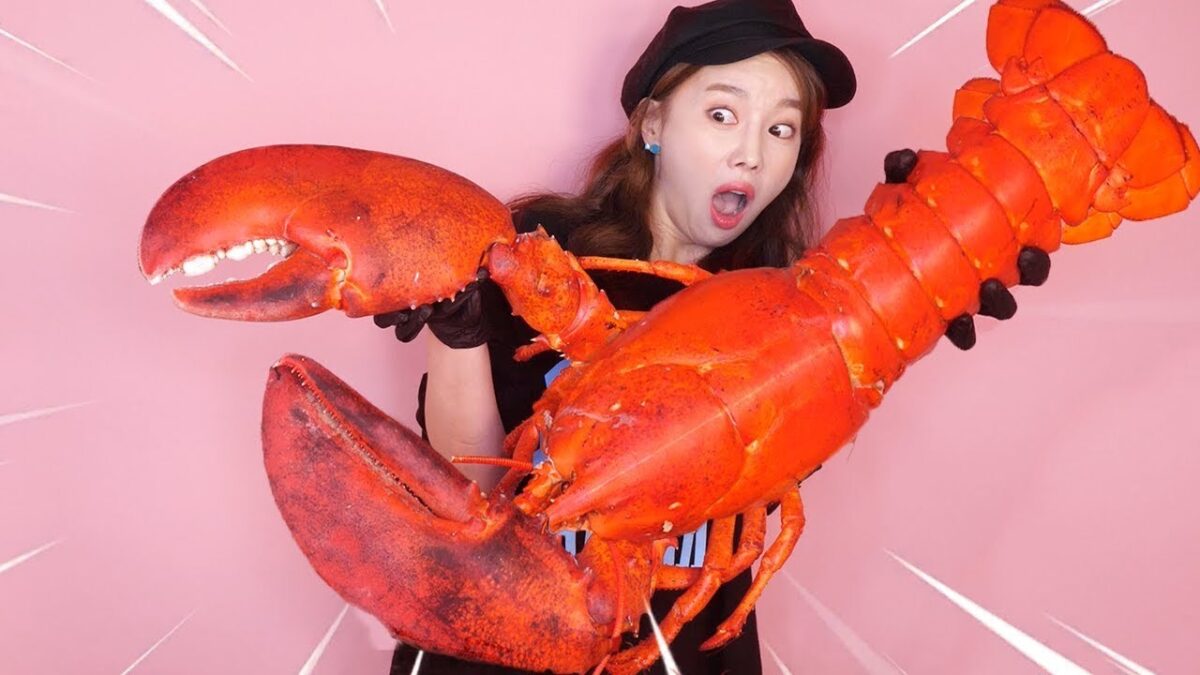 Een tijdje terug zagen we hoe onze Zuid-Koreaanse keukenprinses aan de slag ging met een gigantisch glibberige octopus. Vandaag pakt ze nog iets groter uit en werkt ze een kreeft naar binnen waarvan alleen al z'n klauw groter is dan haar gezicht.