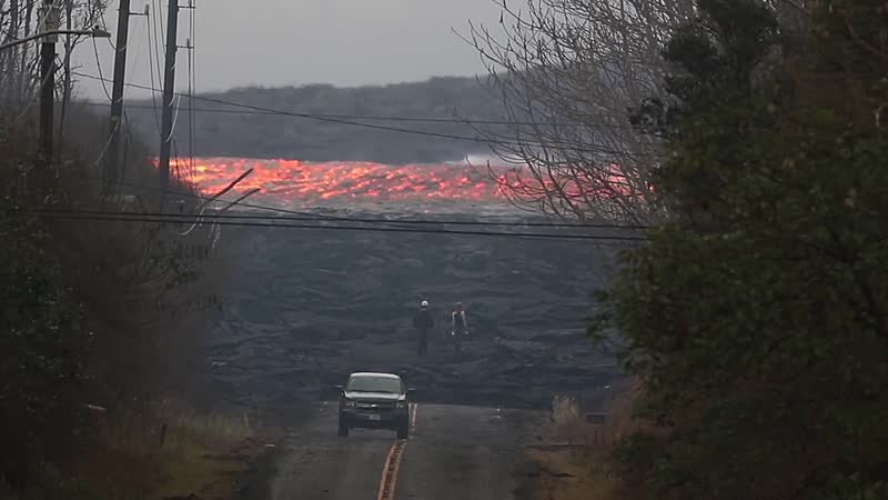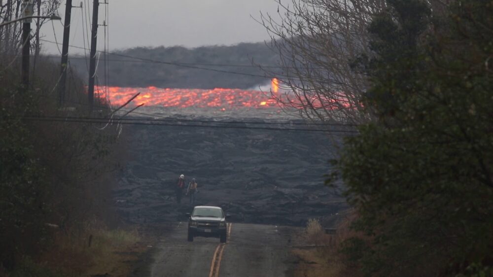 Een lavarivier op Hawaï heft er aardig de vaart in. Wij staan er net zoals deze twee mannen lavaloos naar te kijken.