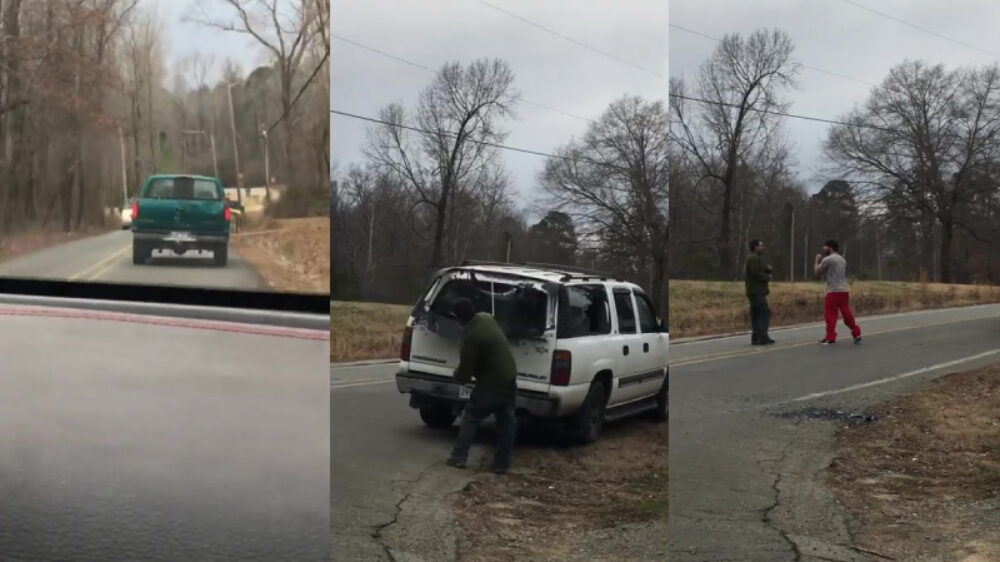Context ontbreekt volledig, maar deze roadrager laat wel een paar autoruiten sneuvelen dankzij welgeplaatste tikken met een ijzeren staaf. Dat laat de bestuurder in kwestie natuurlijk niet op zich zitten.