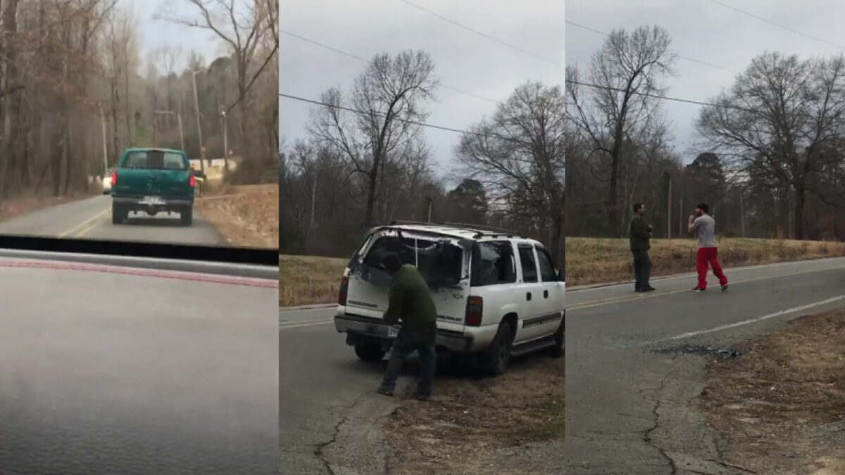Context ontbreekt volledig, maar deze roadrager laat wel een paar autoruiten sneuvelen dankzij welgeplaatste tikken met een ijzeren staaf. Dat laat de bestuurder in kwestie natuurlijk niet op zich zitten.