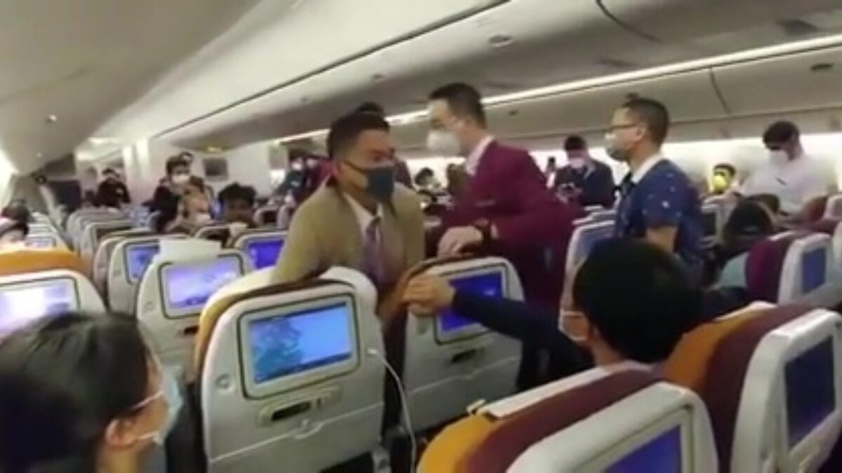 Als je, met de huidige situatie rondom het Coronavirus, in een vliegtuig moet hoesten dan kun je dat beter onderdrukken. Voordat je het weet lig je in een houdgreep en word je het vliegtuig uitgesodemieterd, hetgeen de crew en passagiers van Thai Airways hier demonstreren.