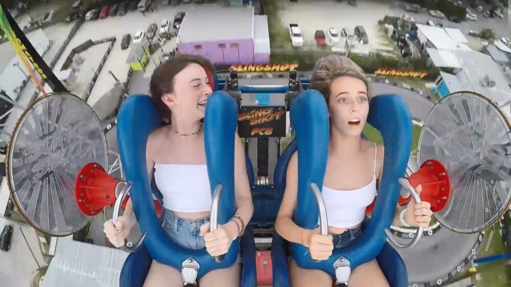 Blondine krijgt niet veel mee van haar ritje in de slingshot als ze steeds nokkie gaat