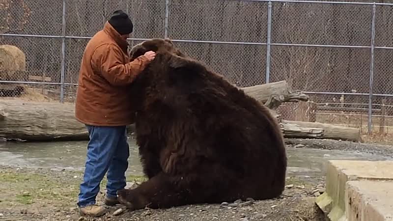 Knuffelbeer wil niet dat zijn verzorger weggaat en trekt hem even lekker terug