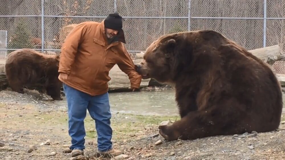 Knuffelbeer wil niet dat zijn verzorger weggaat en trekt hem even lekker terug Dieren