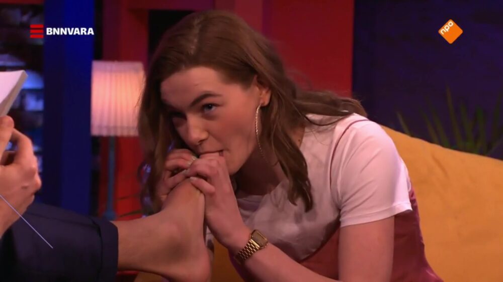Emma Wortelboer sabbelt in lege studio aan de teen van presentator Renze Klamer