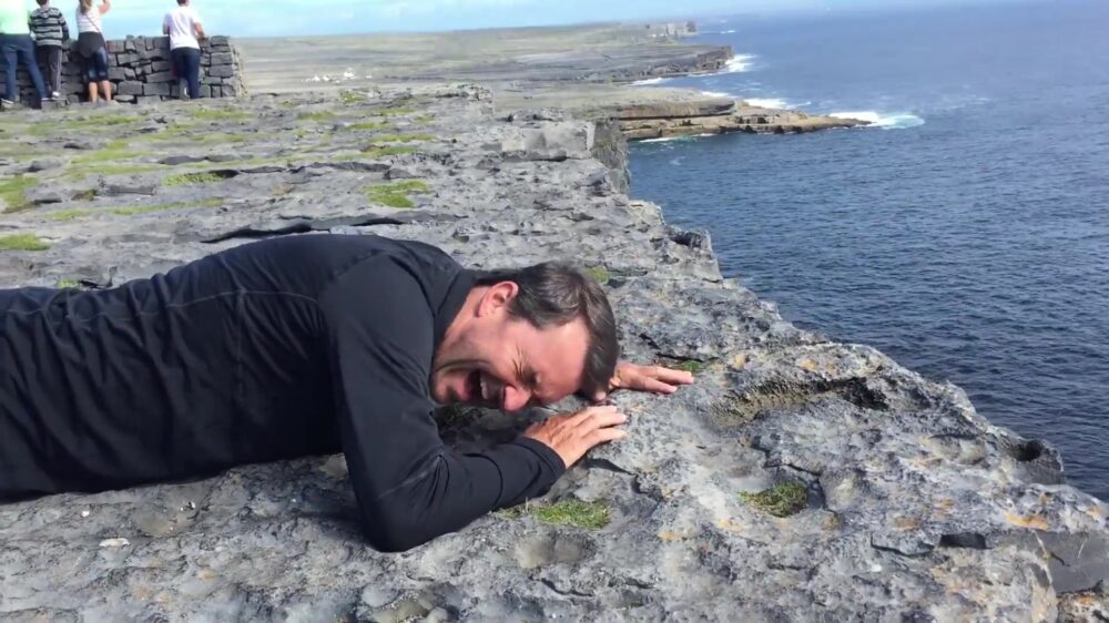 Tsjah, als je bij zo'n hoge afgrond bent aangekomen is het natuurlijk wel heel verleidelijk om even over het randje te kijken. Ook al heb je extreme hoogtevrees.