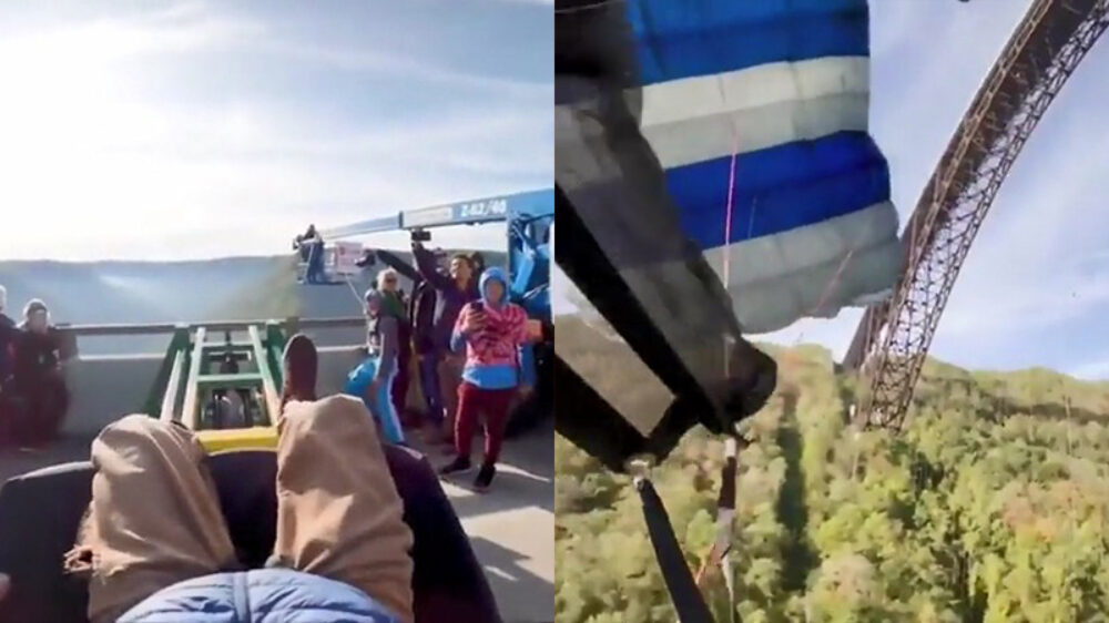 Basejumper doet Angry Birds na en laat zich met een katapult van een brug lanceren