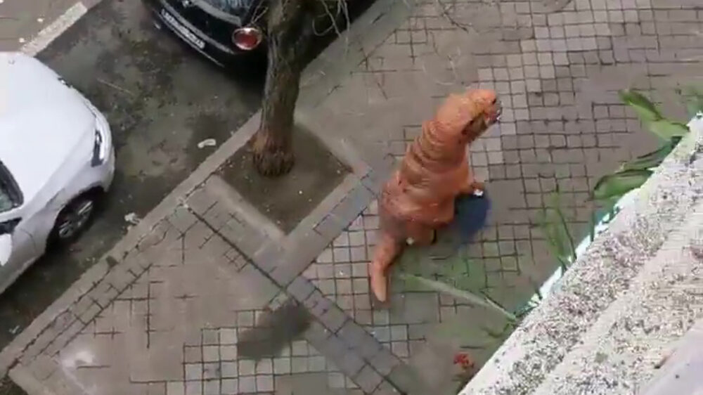 In quarantaine zitten? Niks ervan, dat hoeft namelijk helemaal niet als je een tyrannosaurus rex bent. Hop, naar buiten en gaan met die banaan!