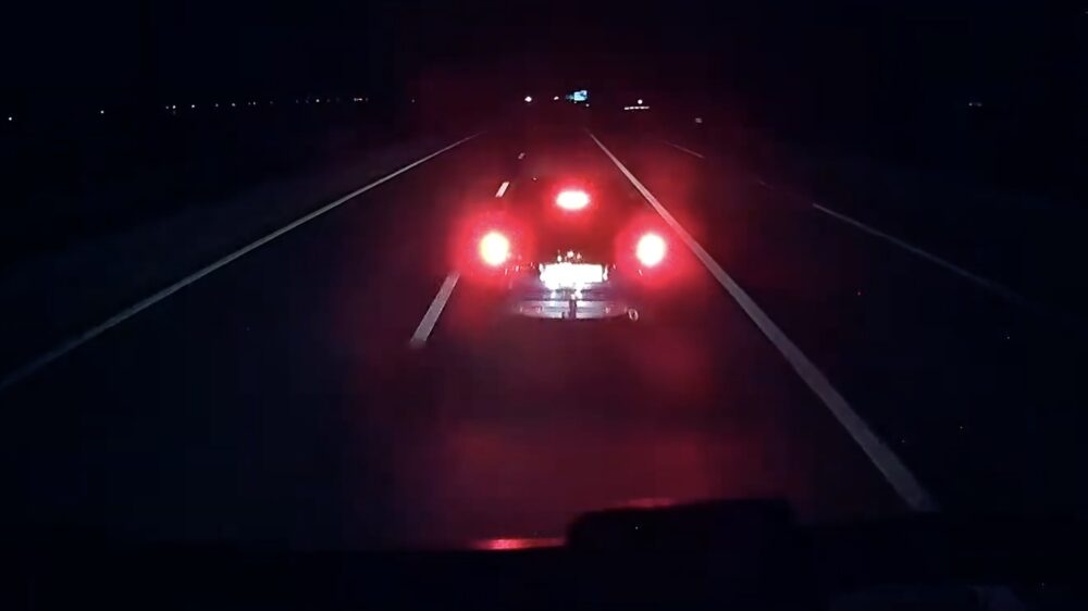 Ook deze Mazda wordt getrakteerd op een portie karma als hij een vrachtwagen een remtestje geeft