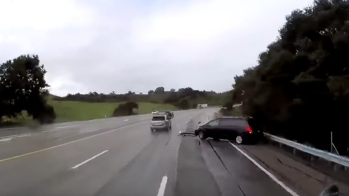 Een automobilist raakt door aquaplaning in de slip en knalt via een reling terug de snelweg op. Gelukkig is deze vrachtwagenchauffeur goed uitgeslapen en weet hij een frontale botsing te voorkomen.