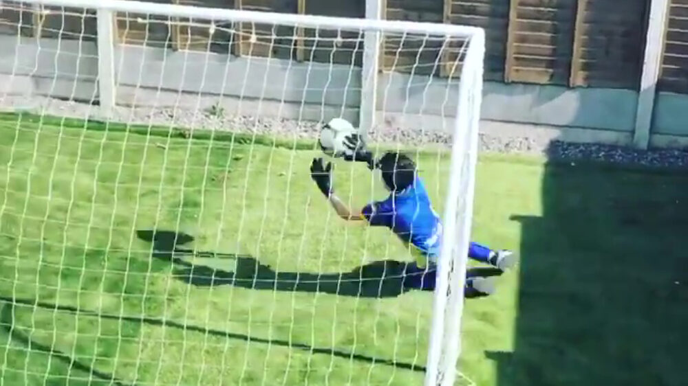 Als voetballertje is het natuurlijk extra vervelend dat je niet naar je training kunt, maar gelukkig weet dit keepertje zich thuis prima te vermaken.