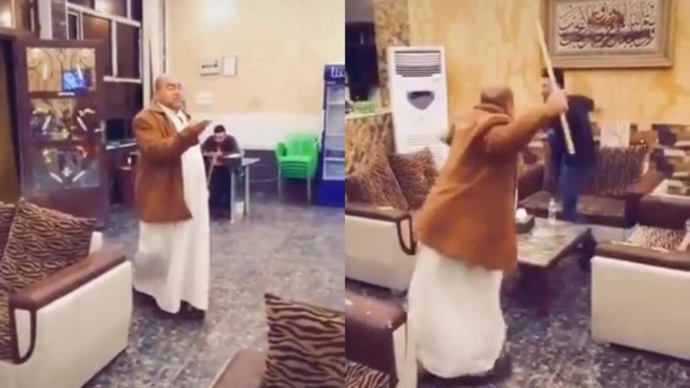 Anderhalve meter afstand houden is voor niet iedereen even makkelijk, maar gelukkig is er op sommige plekken een opa met een wandelstok aanwezig, zoals hier in Irak. Die regelt dat wel even.