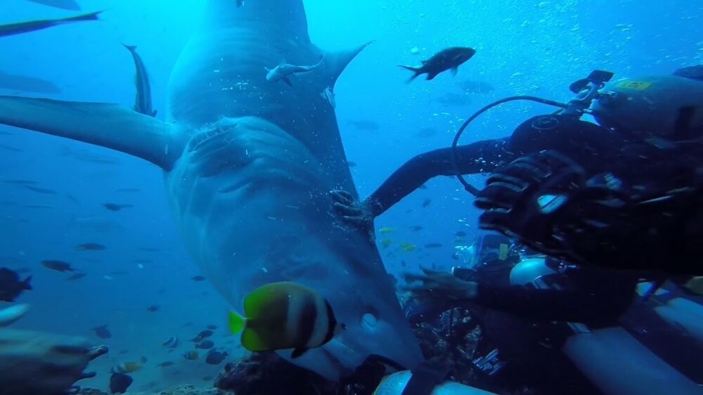 Tijgerhaai besluit om even lekker aan het hoofd van een duiker te knabbelen