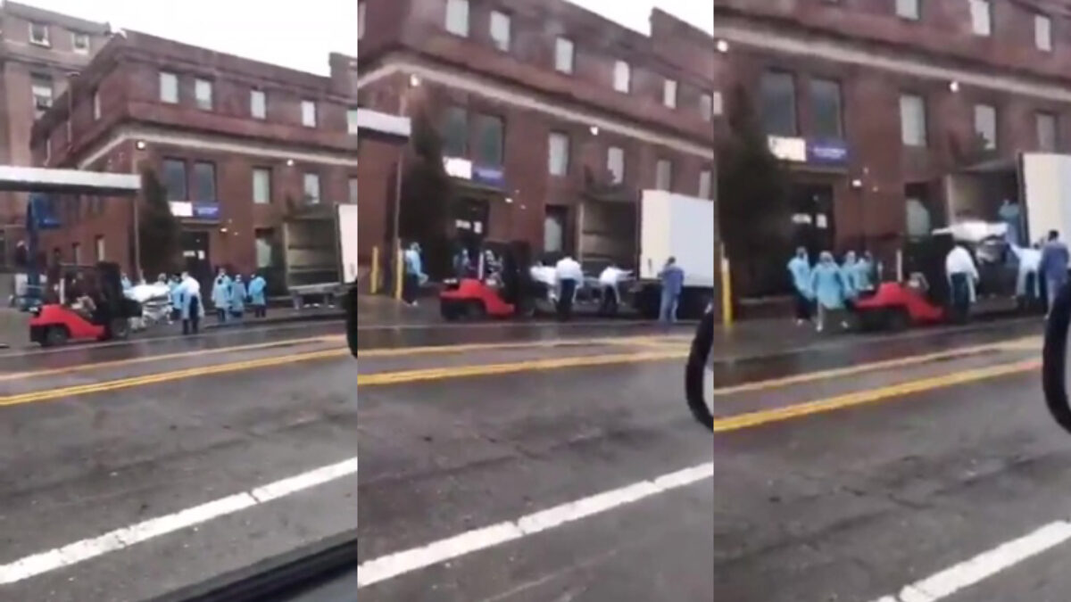 Bizarre video laat zien hoe lijken bij een ziekenhuis in een vrachtwagen worden geladen