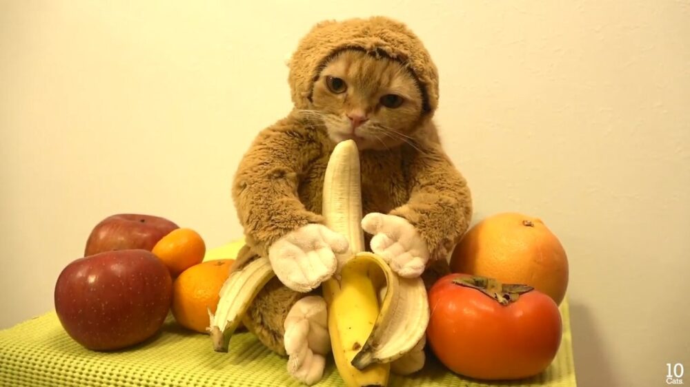 Feelgood in barre tijden: kat geniet van zijn banaan