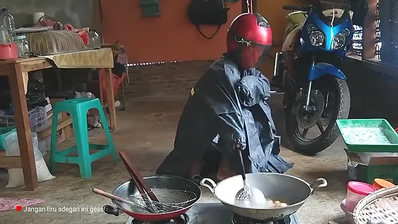 Aziaat draagt helm en regenpak tijdens koken explosieve maaltijd