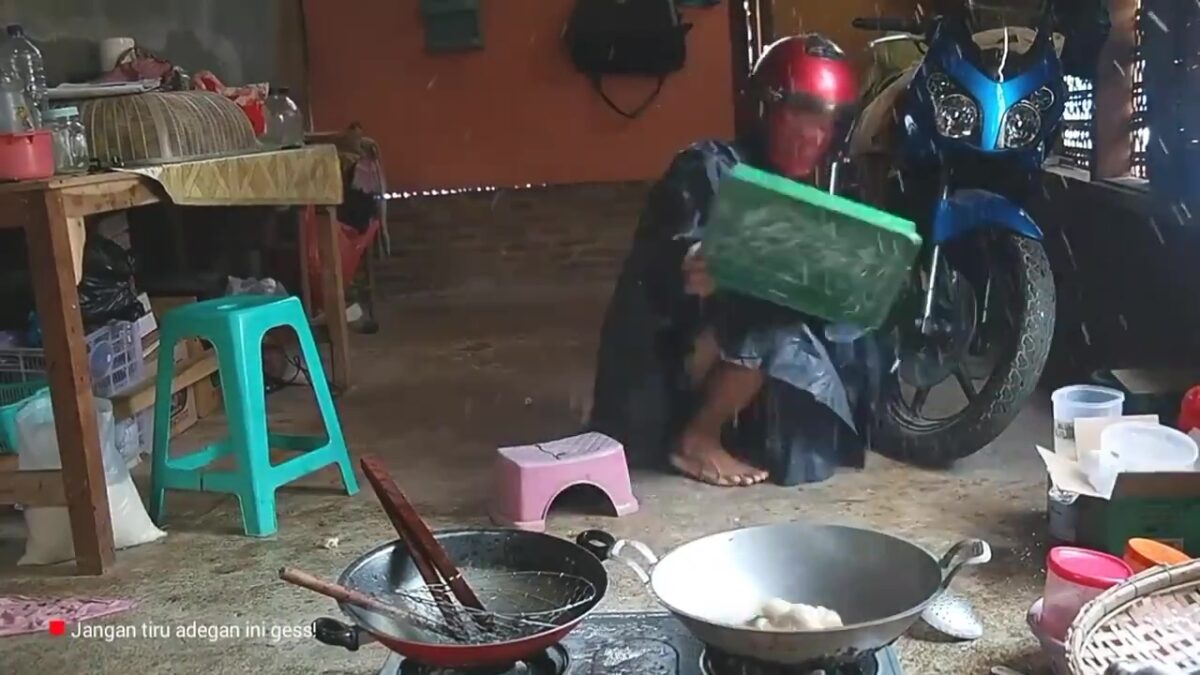 Aziaat draagt helm en regenpak tijdens koken explosieve maaltijd Bizar