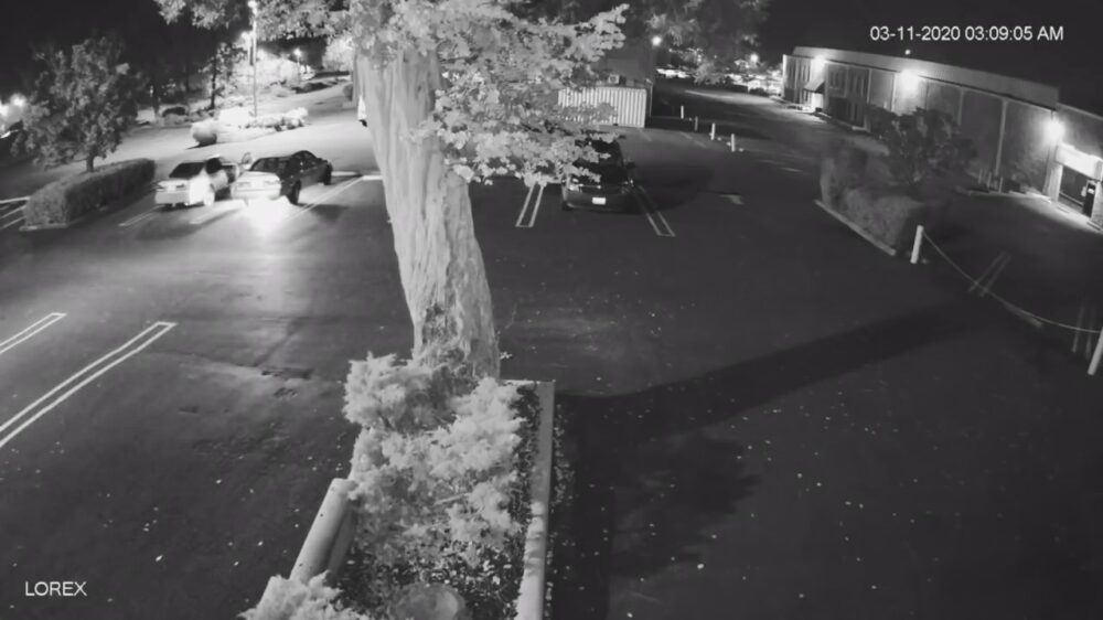 Beveiligingscamera's leggen vast hoe een auto in vlammen opgaat als een of andere imbeciel benzine probeert te stelen terwijl hij een sigaret rookt.