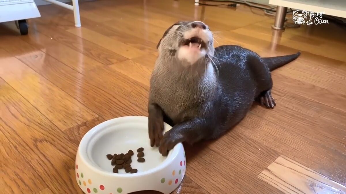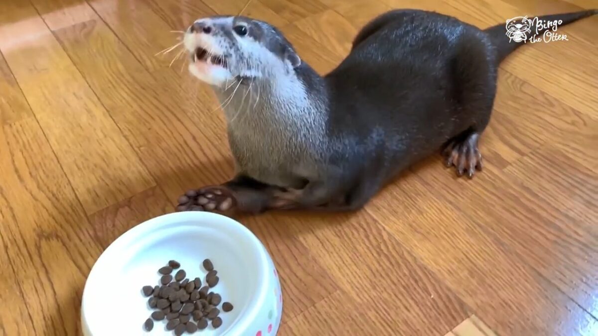 Otter Bingo is extreem blij als hij zijn favoriete kattenvoer krijgt voorgeschoteld