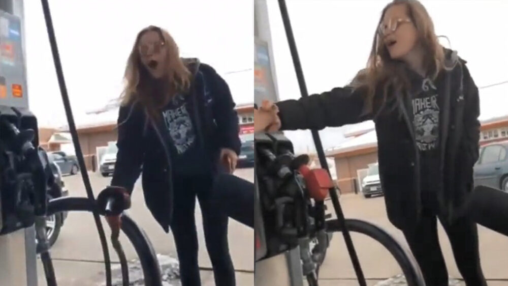 Blondje komt er tijdens het tanken achter dat haar auto onnodig veel brandstof verbruikt