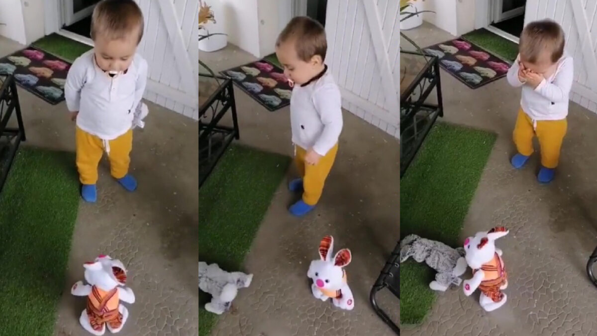 Ook al is het pasen, ook al is het een speelgoedje en ook al is er een koter in de buurt: konijnen gonna konijn.