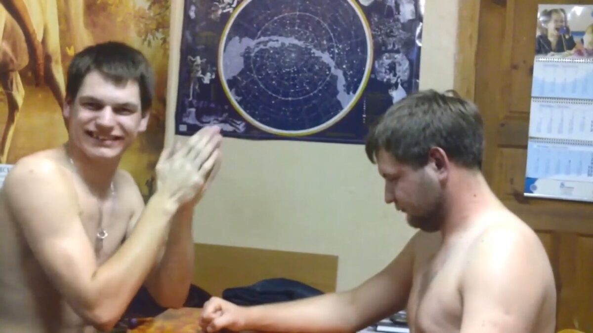 Deze (waarschijnlijk dronken) Russische matties weten ook van het onschuldig spelletje steen, papier, schaar een pijnlijke slapping contest te maken.