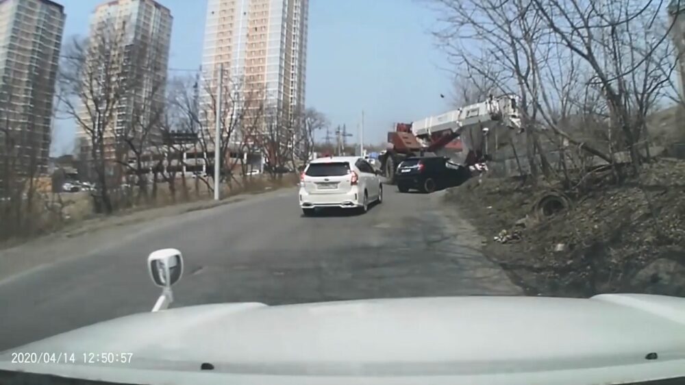 Kraanwagen met defecte remmen knalt bergafwaarts tegen auto en sleurt hem mee