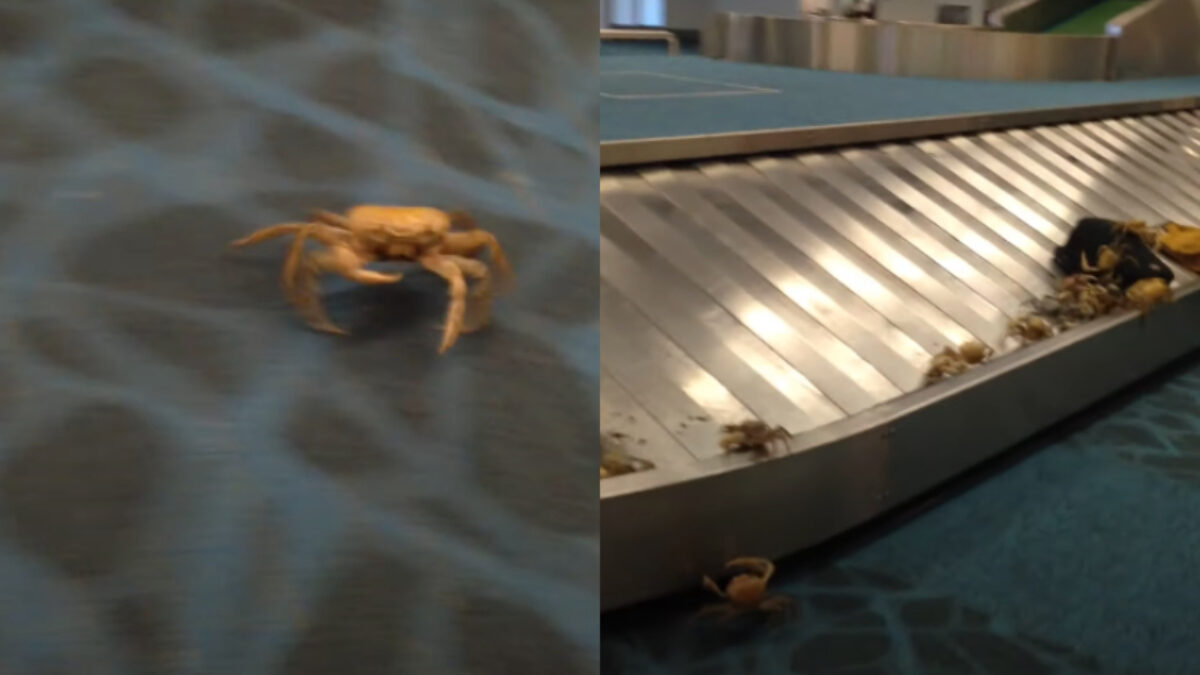 Pardon meneer, u had 200 levende krabben besteld? Deze zijn zojuist voor u aangekomen op bagageband 3. Geen nieuwe video, dit werd namelijk in 2014 gefilmd op de Bahama's, maar het blijft bizar om te zien!